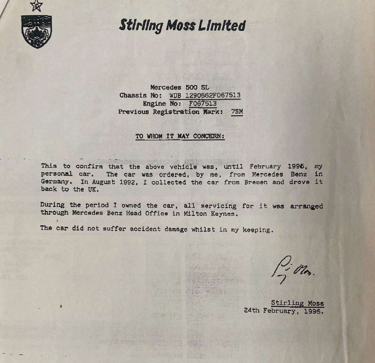 The Mercedes was specially ordered to Sir Stirling’s requirements and collected by Moss himself from Bremen in Germany after its pre-delivery inspection on 24th July 1992, initially registered with a ‘7 SM’ plate the following month. Finish in Silver Metallic with Grey leather upholstery, the 500SL currently has 89,000 miles on the clock. The connection between Sir Stirling and Mercedez goes back multiple decades with the British driver famously winning the 1955 Mille Miglia in a Mercedes-Benz 300SLR.