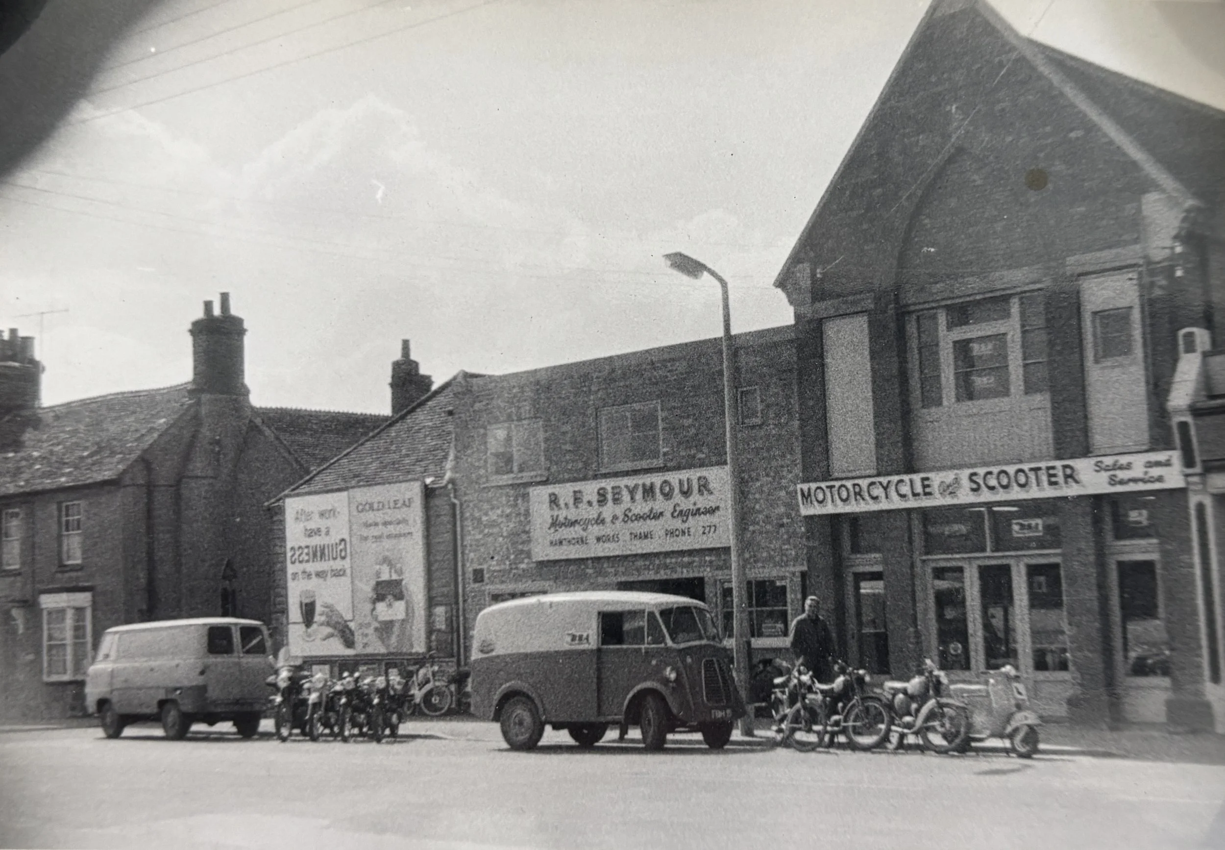 His racing career ended in 1952, and by 1960, he had opened his own motorcycle business, R.F. Seymour’s, in Thame, Oxfordshire. The shop was spread over two floors, with motorcycles having to be pushed up narrow stairs to the second-floor workshop and subsequently winched down from an open back door. R.F. Seymour’s was highly regarded in the local community and the wider motorcycle community, and saw people travelling from all over the world to have their Velocettes repaired there, including one man who brought his engine over from San Francisco on the plane, stowing it in the seat next to him.