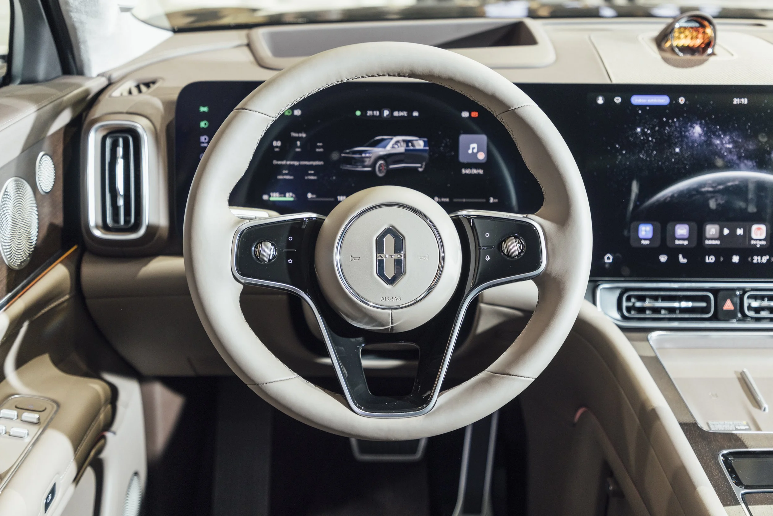 The Chinese tech giant Huawei has played a key part in making the M9 so technologically and luxuriously advanced. The result of the collaboration between Huawei and SERES is a fully aluminium-bodied SUV that is packed with tech-focused gadgetry, including an intelligent cabin and innovative driving features. Up front in the cabin is a triple-screen dashboard featuring individual 12.3-inch, 15.6-inch, and 16-inch screens, all within reach for both the driver and passenger to adjust controls and make adjustments to settings, driver modes and entertainment features.
